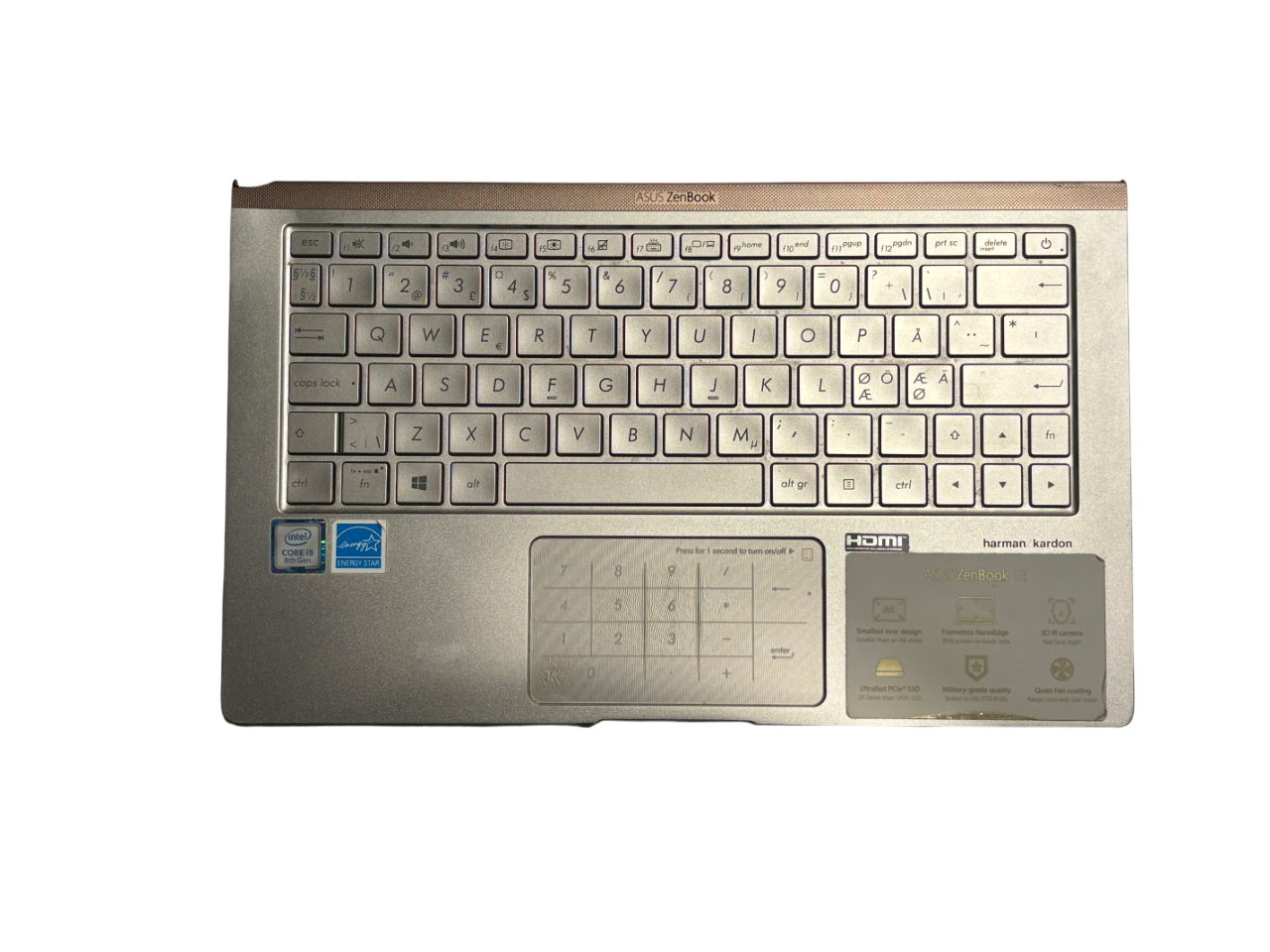“Original palmrest from the disassembly of a used laptop.\n\nThe part fits the ASUS Zenbook UX333F laptop.\n\nTechnical condition: Palmrest damaged due to water damage, keyboard damaged, touchpad – untested. Has a chipped corner near the left hinge. Threaded holes fully functional.\n\nEach palmrest is tested by us with a technologically advanced tester.\n\n30-day warranty.”